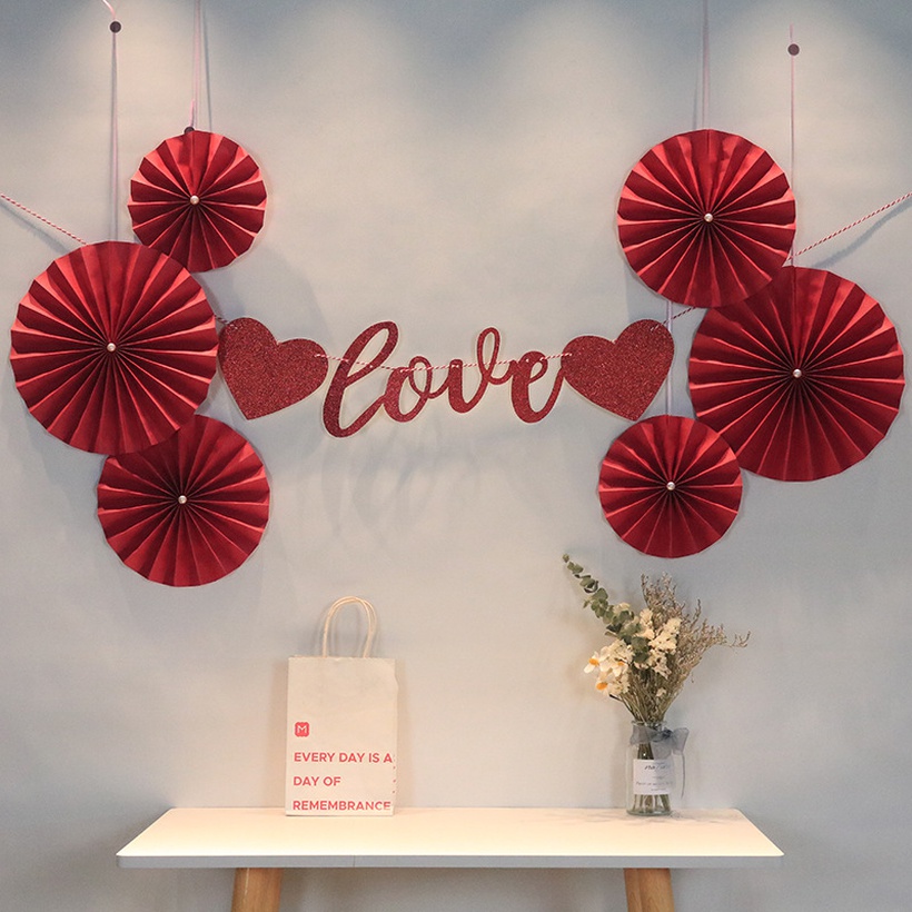 White Pearl Red Paper Flower Fan Wedding Room Background Wall Decoration