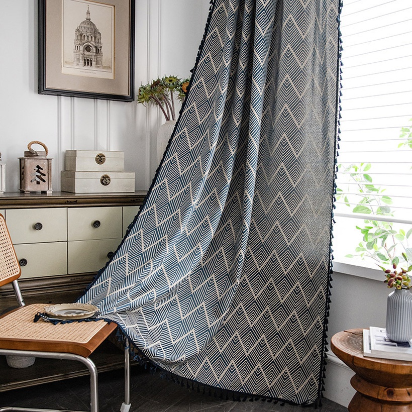 American Wave Knitted Jacquard Navy Blue Tassel Cabinet Curtain Semishading Bedroom Curtain