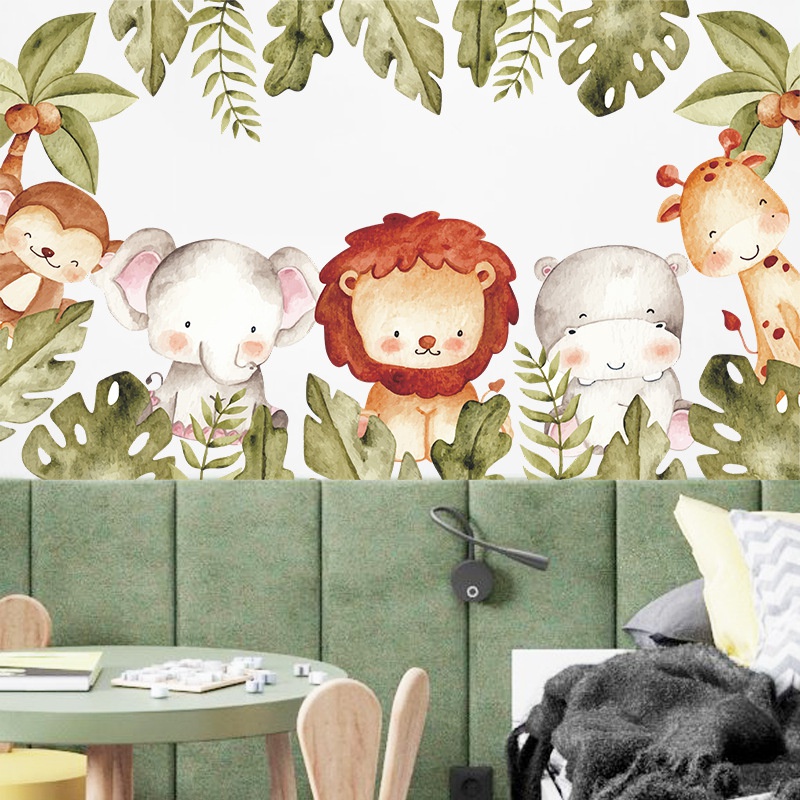 New Cartoon Lion Elephant Monkey Giraffe Green Plants Wall Sticker